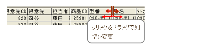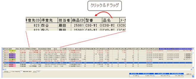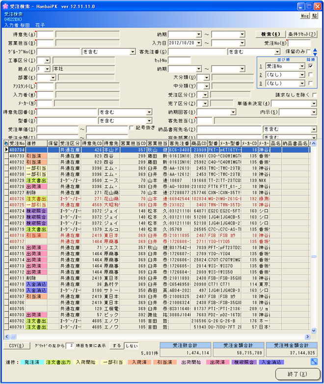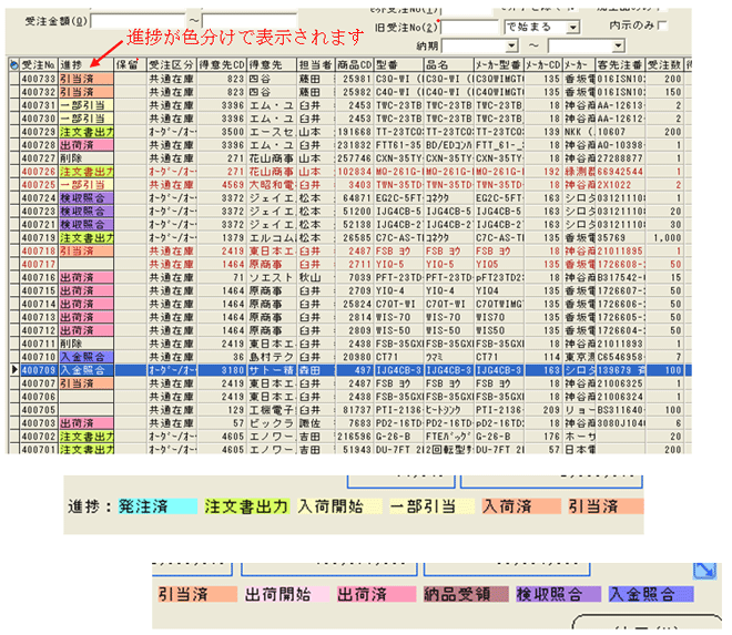 検索の結果は、画面下に一覧表示されます。 進捗状況が色分けされて一覧表出力されるので、全体的な状況が一目で確認 できます。 一覧表の列は、列幅及び並び替えが自由に調整できます。 - 一覧の並び順