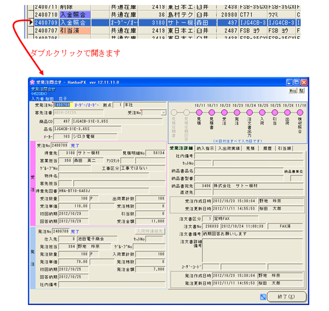 一覧表示された、特定の行をダブルクリックすると、該当受注の受発注問合せ が開き、さらに受注の詳しい情報を見る事ができます。